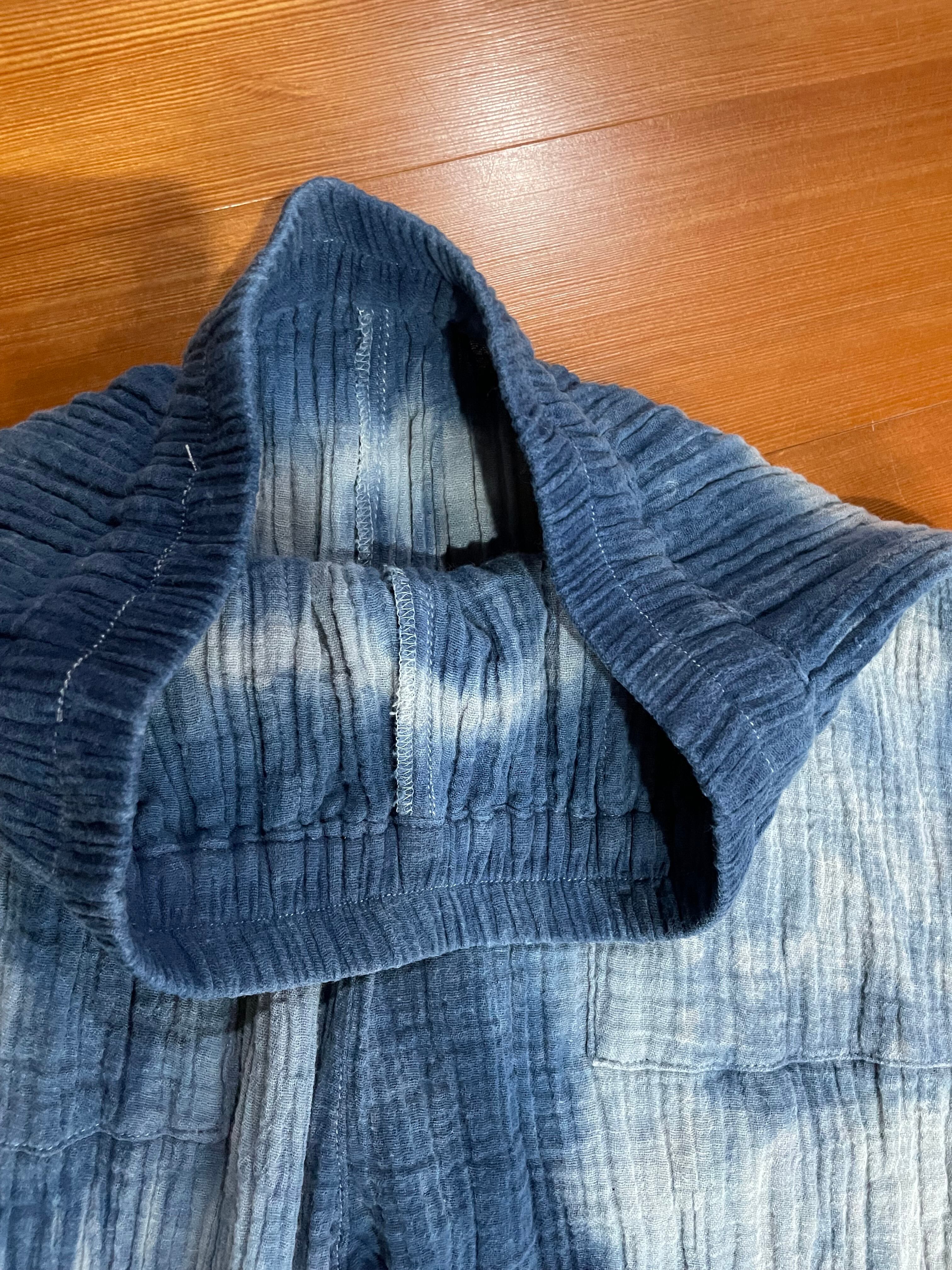 コットンの生地のみ藍で染まっていますが、ミシン糸は白いままであることをご了承ください