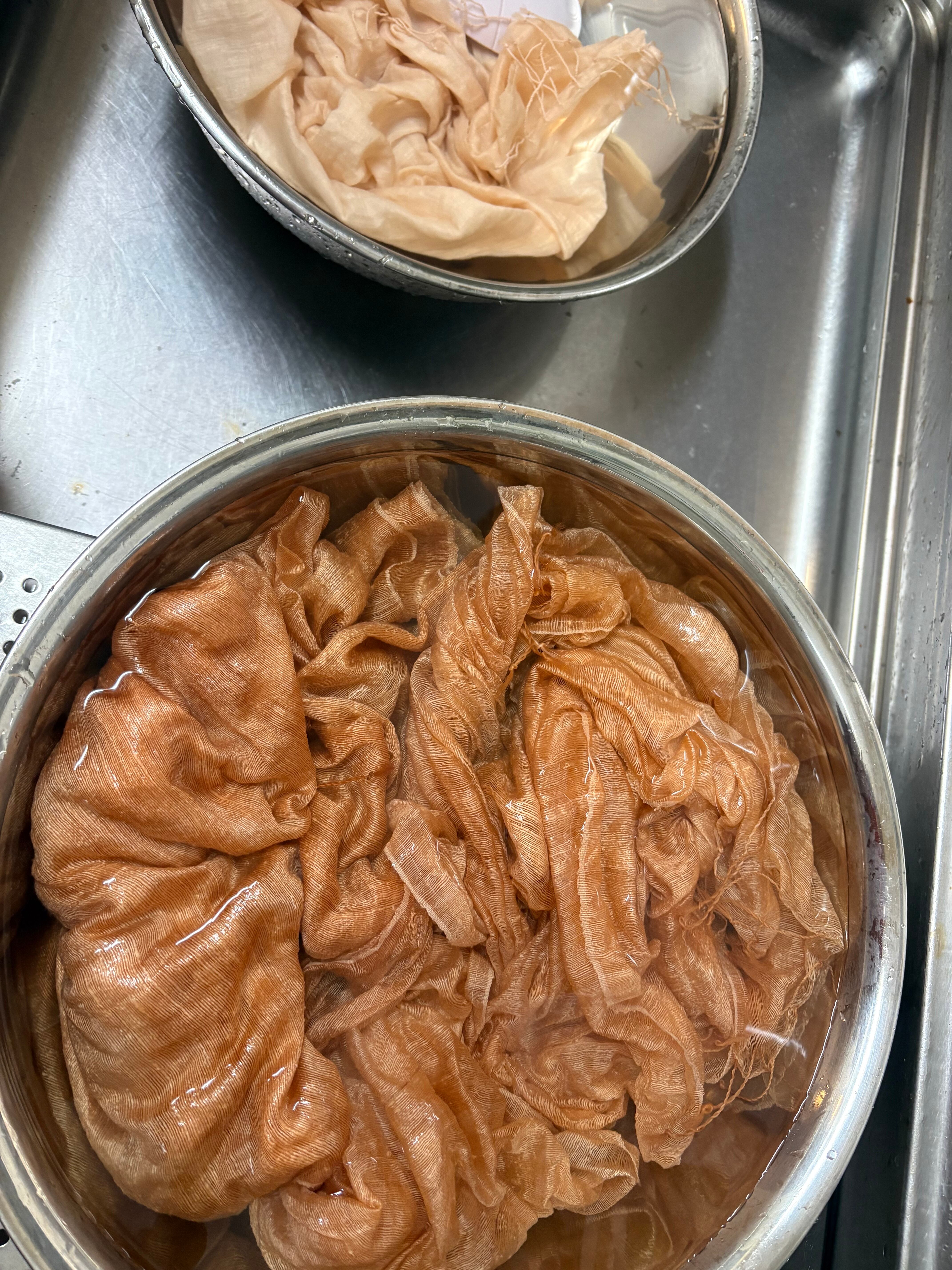 野生の糸は、通常のシルクに比べて染料が染み込みにくく、理想の色を出すために通常の倍以上の時間をかけて、ゆっくり、ゆっくりと染め上げています